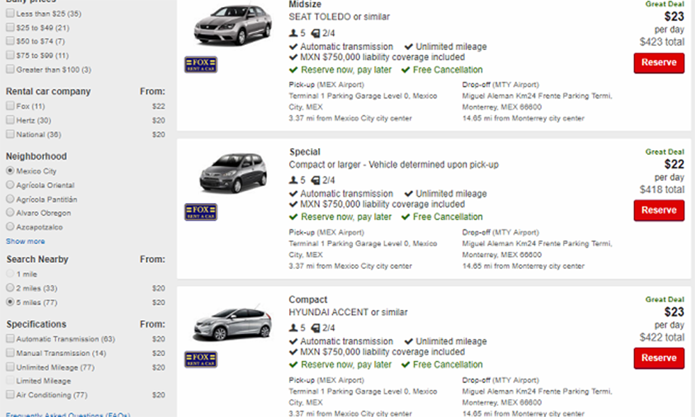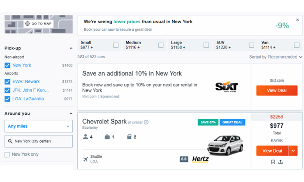 Similar to Priceline, its sister site, Kayak can help you find the best deal on your rented car. However, the results are often different, so be sure to check both sites out. Kayak offers many filters and shows your results on a map. Kayak also compares the prices to the average in your location.