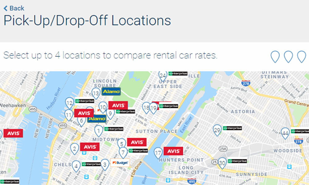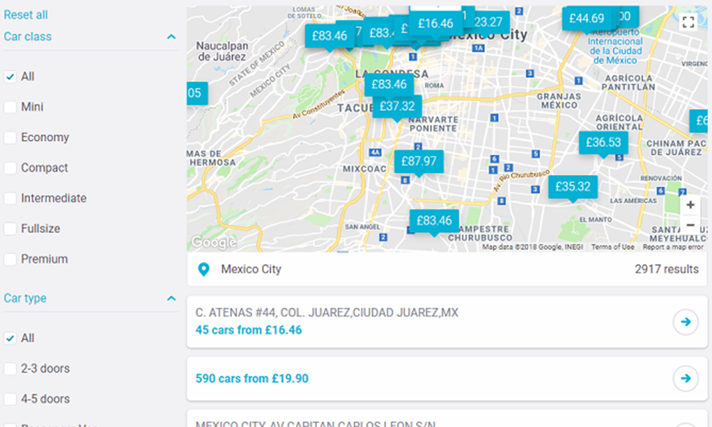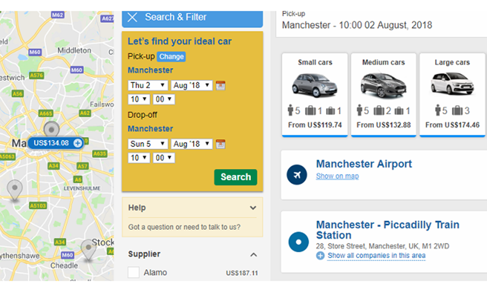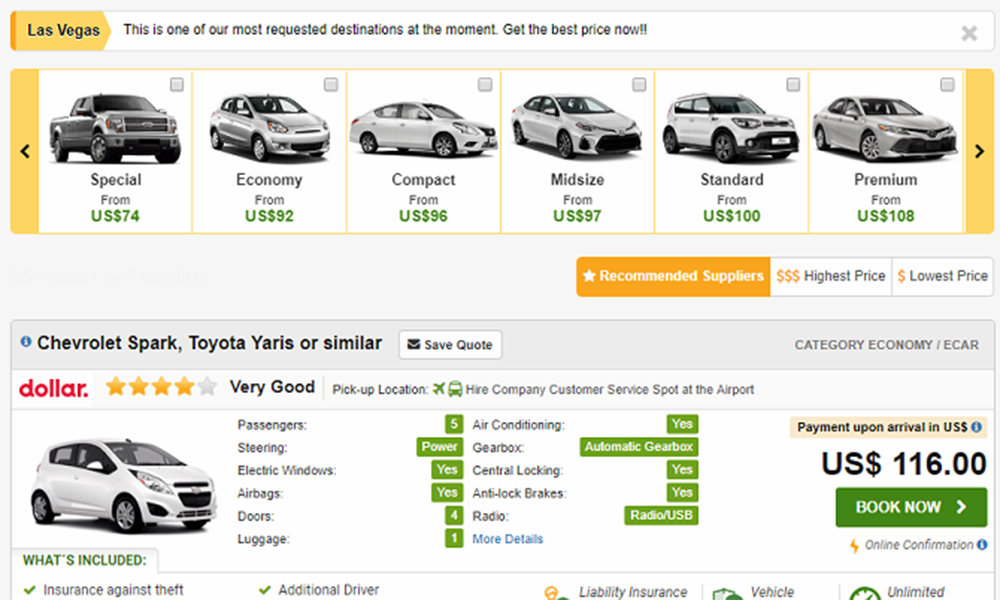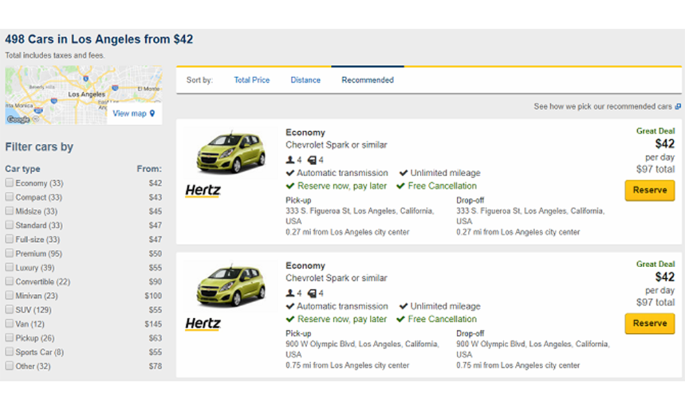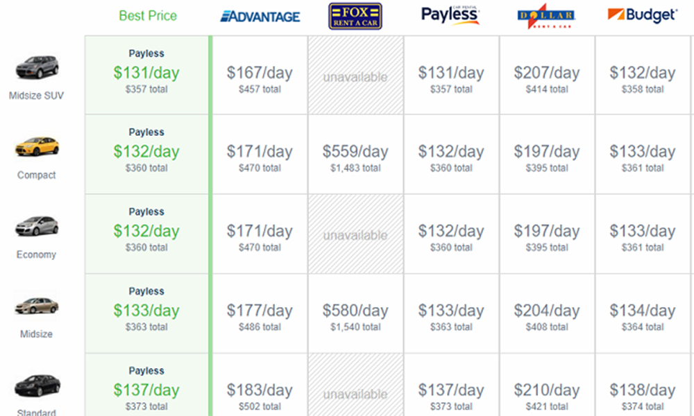 Hipmunk’s prices are compatible with all the other sites we have already mentioned. The downside is that it only supports pick-ups and drop-offs at airports. On the other hand, this site has a chart-based layout which makes it incredibly easy to compare prices.
